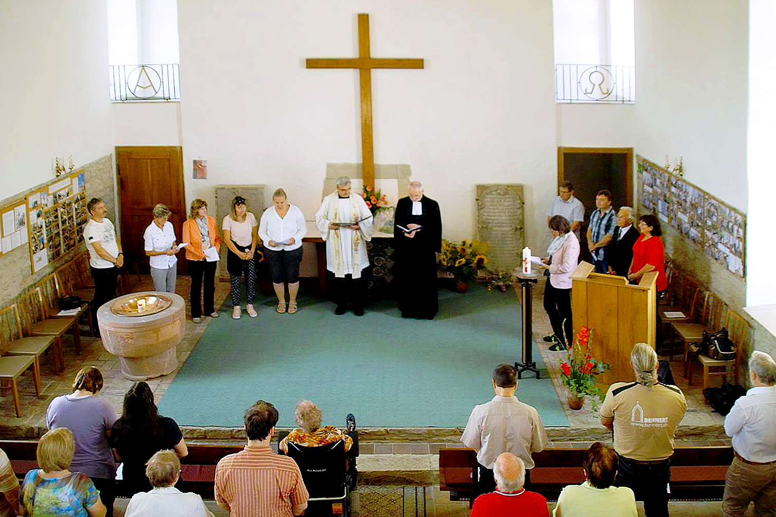 Nach der Verkündigung des Evangeliums durch Pfarrer Friedrich zu Matthäus 5, 13-16 „Salz und Licht“ und der Predigt dazu von Pfarrer Keilholz erfolgten Gebet und Einsegnung zur Wiederaufnahme der Gottedienste in unserer über 300jährigen Rehmsdorfer Kirche. Das Fürbittgebet sprachen katholische und evangelische Christen mit beiden Pfarrern gemeinsam.