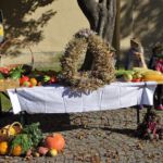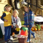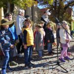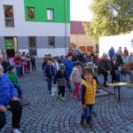 Nach einem ersten gemeinsamen Lied, unter freiem Himmel und mit gehörig Wind zwischen den Reihen, brachten die Kinder des Kindertreffs die Bibel, Trauben, ein Brot und weitere Erntegaben zum Altar. Die große Gruppe der Kita Anne Frank spielte die Geschichte vom „Rübchen„. Zu einem Erntedankgottesdienst gehört natürlich auch eine biblische Lesung. Das Speisewunder hatte heute einen ganz aktuellen Bezug, denn die „Menschenmenge“ war auch auf dem Markt erfreulich groß. Von sieben Broten sind 4000 Menschen im biblischen Wort satt geworden.