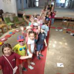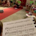 Am Mittwoch wendeten wir uns dem Thema Krieg zu. Mit der Frage: Wohin führt es, wenn Hass und Streit regieren? Dazu war ein Zeitzeugengespräch geplant. Leider haben die sehr heißen Temperaturen uns da einen Strich durch den Plan gemacht. Die hochbetagte Zeitzeugin konnte nicht zu uns kommen. Da es schon vorab ein Gespräch gab, konnte das Thema trotzdem angegangen werden. Mit den Kindern schauten wir auf die Zeit vor 100 Jahren und näherten uns dann dem Geschehen vor und während des zweiten Weltkriegs. Auf kindgerechte Weise wurde darüber gesprochen, dass Gesetzte nun bestimmten, wer ein richtiger Mensch ist und wer nicht. Das empörte die Kinder in der Runde – zu recht. „Sowas geht doch nicht“ und „Das darf man nicht“ waren ihre Reaktionen.