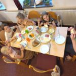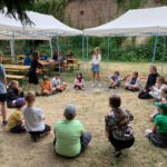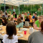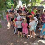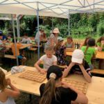 Am frühen Donnersagmorgen erwachten die ersten Kinder und schon um 7 Uhr machte sich eine kleine Gruppe auf den Weg zum Bäcker in Wählitz. Sie holten die Brötchen für die ganze Gruppe. Alle anderen deckten die Tische. Nach einem Frühstück in der morgendlichen Kühle wurden die Schlafplätze beräumt und wir starteten gemeinsam in unseren letzten Tag. Wir sangen viel, wie schon in den letzten Tagen und schauten noch einmal auf unser Thema. Ein letztes Bild für den Frieden schauten wir uns an. Das Lied „Der Laden“ von Gerhard Schöne erzählt uns davon, was es für den Frieden braucht: Uns. Uns, die wir uns um die kleinen Samen kümmern.