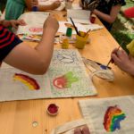 Der Montag begann mit Ankommen und Kennenlernen. Viele „alte Hasen“ kannten sich und uns bereits. Manch neues Kind wurde schnell mit aufgenommen. Wir sangen und erzählten uns gegenseite viel über uns. Dazu stellten wir uns in einerlangen Reihe auf: nach Größe, nach Klassenstufe, nach Anzahl der Geschwister oder auch nach Herkunftsort. Nach einer großen Portion Kartoffelbrei und Fischstäbchen widmeten wir uns dann dem Thema Frieden und schauten zunächst auf das offensichtliche: Zeichen für Frieden. Woher kommt der Regenbogen? Das Peace-Zeichen mit den Fingern? Das CND-Zeichen? Die Taube? In Stationen lernten die Kinder etwas über die Herkunft und konnten sich das Zeichen auf ihren Beutel drucken, sprühen, malen oder stempeln.