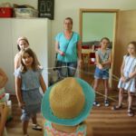 Der Dienstag hielt dann die nächsten Themen bereit. So ging es ums erzählen. Dabei guckten wir uns erst mal einen Menschen ganz genau an. Wenn ich diesen Menschen nun meinen Freunden beschreibe oder meiner Oma, gibt es dann einen Unterschied? Was bleibt gleich, was ist verschieden? Wer noch nicht Schreiben kann, der dasrf immer auch Malen. So entstand eine schöne Galerie. Zwischendurch immermal wieder in der kühlen Kirche singen. Nach einer Stärkung mit Nudeln ging es dann an die Vorbereitung zum Schreiben, denn dafür brauchen wir Papier! Das Schöpfen ist gar nicht so einfach, doch viele individuelle Werke sind entstanden. Zwischendurch waren die Bao-Spiele immer sehr geschätzt oder auch die Bogensport-Ecke.