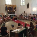 Dann hieß es aufräumen in den Zelten und auch schnell abbauen, bevor es regnet. Durch knapp 60 fleißige Hände war das auch schnell erledigt. Nun konnten wir den Regen genießen und in der Kirche unser Thema starten. Zum Schreiben gehört ein wichtiger Text. Ein biblisches Wort, welches vielleicht aus einer Geschichte stammt oder als Taufspruch schon zu einem Kind gehört. Dieses biblische Wort haben wir uns notiert und wollten es eigentlich mal in Schönschrift üben. Doch der Regen hielt uns in der Kirche fest – darum wurde hier gespielt und der Turm bestiegen. Danach erst konnte noch ein wenig geschrieben und gebastelt werden.