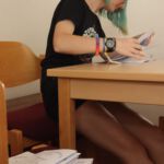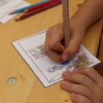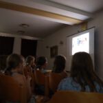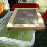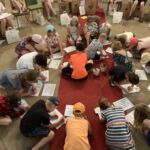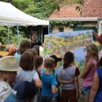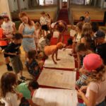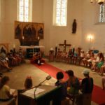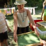 Der Dienstag hielt dann die nächsten Themen bereit. So ging es ums erzählen. Dabei guckten wir uns erst mal einen Menschen ganz genau an. Wenn ich diesen Menschen nun meinen Freunden beschreibe oder meiner Oma, gibt es dann einen Unterschied? Was bleibt gleich, was ist verschieden? Wer noch nicht Schreiben kann, der dasrf immer auch Malen. So entstand eine schöne Galerie. Zwischendurch immermal wieder in der kühlen Kirche singen. Nach einer Stärkung mit Nudeln ging es dann an die Vorbereitung zum Schreiben, denn dafür brauchen wir Papier! Das Schöpfen ist gar nicht so einfach, doch viele individuelle Werke sind entstanden. Zwischendurch waren die Bao-Spiele immer sehr geschätzt oder auch die Bogensport-Ecke.