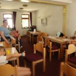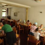 Nach einem fischigen Mittag widmeten wir uns dem Erzählen. Wie ist das eigentlich, wenn wir uns an etwas erinnern, zum Beispiel die letzen KinderFerienTage? Achso – jede erinnert sich an etwas anderes. Und manches war für alle sehr einprägsam. Wie ist es, wenn nun eine kleine Botschaft von Mensch zu Mensch weitergegeben wird? Da kann schon mal aus „Ananas schneiden“ – „Hände waschen“ werden. Und dann versuchten wir alle gemeinsam, nach einem kurzen Blick, ein großes Bild zu beschreiben. Worum gings? Ach um das „Leben Jesu“ Und schon war der erste Tag vorbei und es hieß kurz Abschied nehmen.