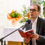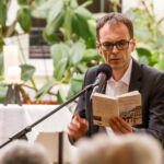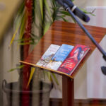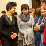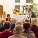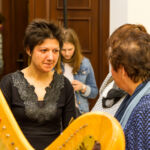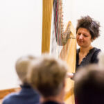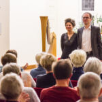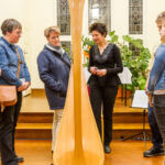 Nach Ende des Programms nutzen die Zuhörerinnen und Zuhörer die Gelegenheit, um mit dem Autor ins Gespräch zu kommen oder sich von der Harfenistin ihr Instrument vorstellen zu lassen. Oder sie standen und saßen noch beim Imbiss zusammen und ließen den Abend auf ihre Weise ausklingen, redend und manche auch bewegt schweigend.