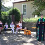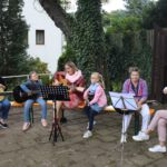 Um 10:30 Uhr begann dann ein Familiengottesdienst. Die Gitarrengruppen aus Teuchern unter der Leitung von Ingrid Gätke begleiteten die Lieder. Unter freiem Himmel war ein vielstimmiger Gesang zu hören, denn die eingängigen Melodien luden Alt und Jung zum Mitsingen ein.