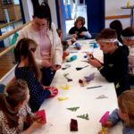 Die Kinder bastelten an 4 Stationen Dinge, die mit dem Thema und dem Land zu tun haben. So wurde ein Kopfschmuck aus Stoff gestaltet, eine Friedenstaube gefaltet, Lampions mit Kordeln gebastelt und aus Stoffresten Bälle zum Spielen genäht.