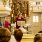 Die Vorsitzende des Gemeindekirchenrates, Ellen Heinichen, gab in zwei geschichtlichen Abrissen Einblicke in die Sanierung der Orgel und auch der Kirche, die vor 20+1 Jahren umfangreich saniert worden war, und würdigte etliche Aktive der beiden Großprojekte.